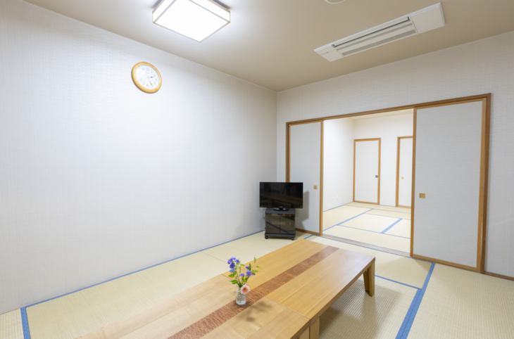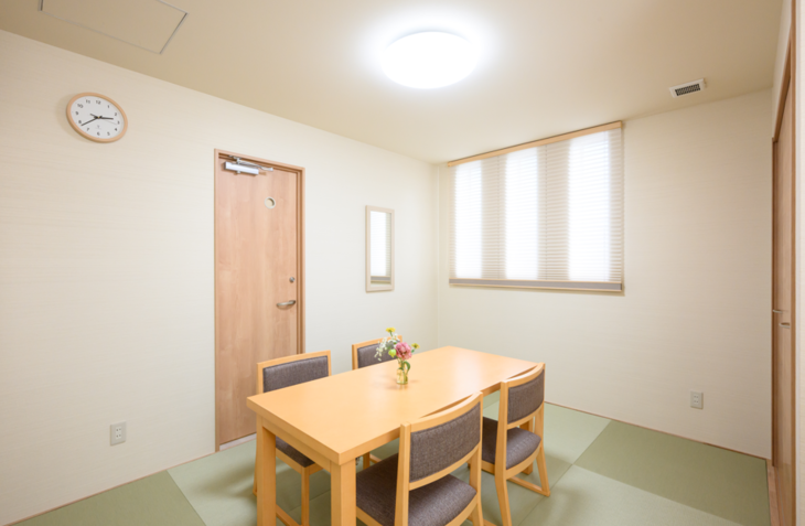 会食スペースがあり、ご家族様のみであったりご親戚やご友人様を呼んでなど状況に応じてゆっくりと会食を行えます。控室は和室になっており浴室や寝具もございます。