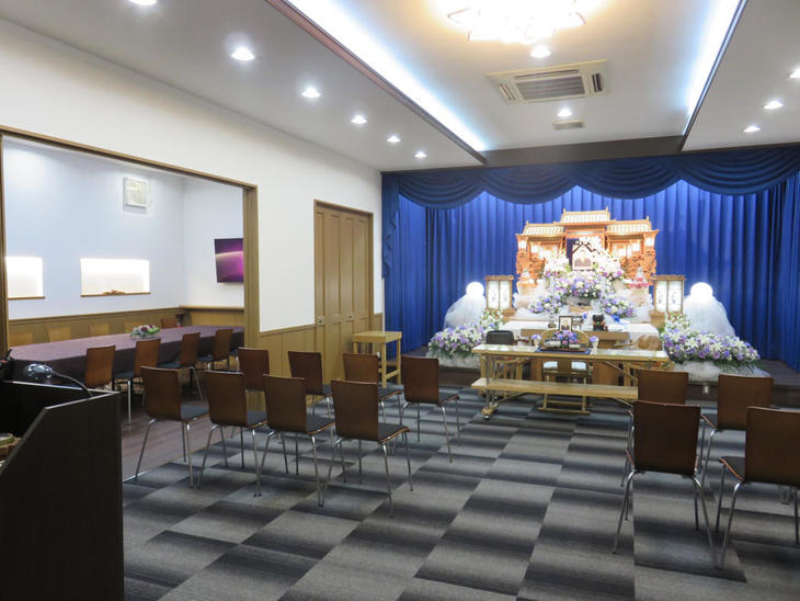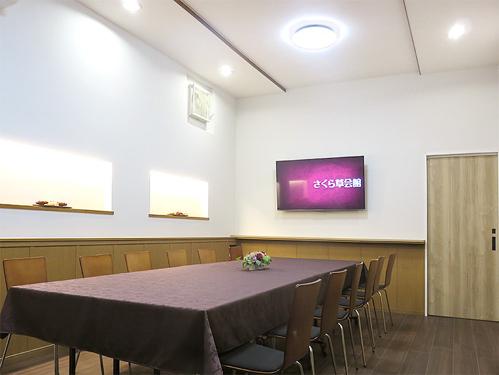 40席が入る家族葬ホールです。館内はリニューアルをしており、綺麗な落ち着いた雰囲気が特徴です。